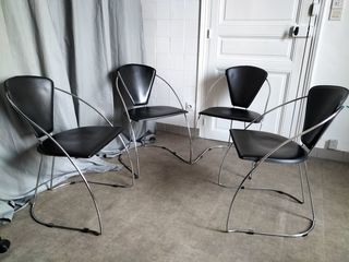 4 chaises design type Arrben, avec piètement chromé, assise et dossier en simili cuir noir. Chaise confortable, en bon état, pour bureau, salle de réunion ou salle à manger. Le