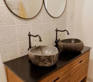 Meuble haut et bas en bon état couleur rouge laqué Profondeur du meuble haut 26 cm Longueur du meuble haut 180vm Possibilité de ranger beaucoup de choses Profondeur du meub