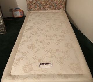 Literie complète : sommier + matelas + tête de lit tapissier + 4 pieds La tête de lit peut être retapissée avec un autre tissu car réalisée par un tapissier Marque Mérinos haut