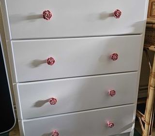 Petit meuble avec deux tiroirs et un miroir.
