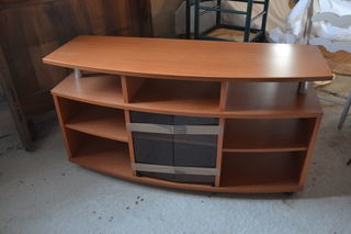 meuble télévision sur roulettes, en bois massif, avec vitres et étagères. Trés bon état long 1,40, ht 0,73 et prof 0,50
