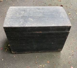 Malle de voyage ancienne, noire, couvercle bombé, à restaurer, avec un fort potentiel de rangement et de déco. La restauration consisterait à boucher le trou en bas à l'arrière