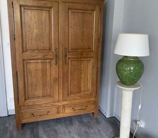 objets et meubles a prendre sur place, pas d'expédition. Tableaux et decos mural, bureau et chaise de bureau, armoire chene massif ébenisterie avec colonne albâtre et lampe salon,