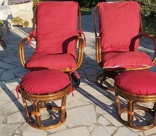 2 fauteuils pivotant 360° en Bambou et Osier avec 2 poufs de même matériel. Coussins rouge.