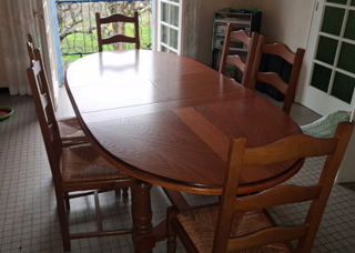 A vendre à Miramont de Guyenne (Lot et Garonne) , salle à manger en bois massif, très bon état : 1 table ovale de 2.05m de long (rallonge incluse) et 1.10m de large + 6 chaises dos