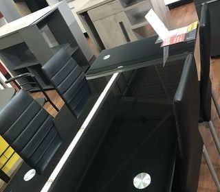Vend table + les quatre chaises en similicuir la dernière photo montre une des quatre chaises avec une griffure la troisième photo o๠c'est entouré de blanc montre une griffure