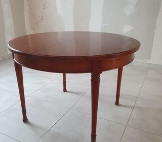 Pour raison de changement de décor, vends table de salle à manger en merisier massif, signée "Camille et Vence", avec 2 rallonges, Possibilité 4, 6 ou 8 couverts. Excellent état