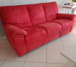 vends 1 canapé 3 places dont 1 relax et 2 fauteuils dont 1 relax en tissus rouge dimensions longueur 185 largeur 80 hauteur 95 cms