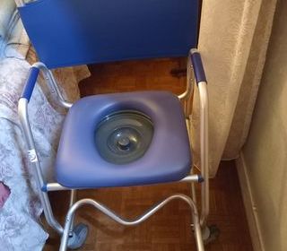 Chaise de douche et d'aisance équipée de quatre roues libres indépendantes dotées de 2 freins individuels. Avec reposes pieds. Très maniable, légère, Largeur totale 57 cm, profond