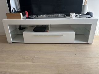 Meuble TV de couleur blanche, marque BUT Acheté en 2019 pour 200e, je le propose à 45e Très bon état Dimensions : - Longueur : 153cm - Largeur : 44cm - Hauteur : 45cm
