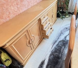 1 bar + vitrine à verres 2 chaises de bar 1 bahut bas 1 table ovale +6 chaises