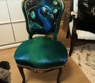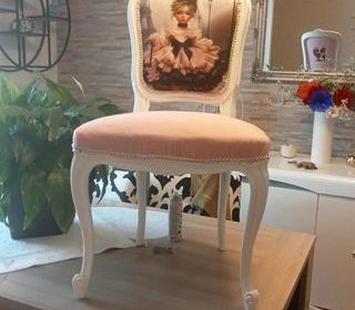 chaise relookée par mes soins pour fillette tissu velours du dossier , transfert au dos assise tissu pailleté rose et finition galon clouté a prendre a mon domicile a sept