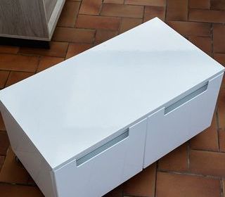 Joli petit meuble de salle de bain 2 tiroirs, de couleur blanc brillant muni de 4 roulettes. Peut aussi servir pour tous autres rangements. Dimensions: longueur 70 cm x profondeur