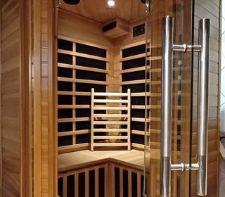 Vend en très bon état un SAUNA avec des panneaux infrarouge 100% carbone à l'intérieur avec une puissance 1800 W La cabine est en angle pour 2 ou 3 personnes, les panneaux sont en