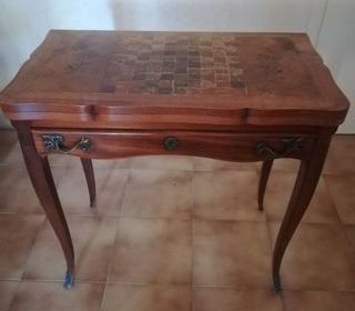 Table de jeux Pliée, dessus marqueterie damier Ouverte plateau recouvert feutrine verte. Trés ancien A prendre sur place Pas de livraison Paiement en espèces.