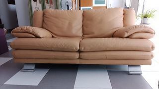 A vendre un canapé 2 places moderne en cuir grainé fin en excellent état. Les pieds sont en acier inoxydable. Le confort des assises est moelleux et très relaxant. La couleur Camel