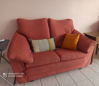 Vends canapé 2 places en tissu avec coussins déhoussables, de couleur brique, en très bon état. Dimensions extérieures : 155cm (L, à l'endroit le + long, au niveau des accoudoi