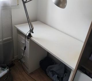 Je vends ce bureau en bois blanc. - Type de produit : Bureau - Matériau : Bois - Couleur : Blanc - Fonctionnalités : 4 tiroirs de rangement + une case - Vendu avec la lampe