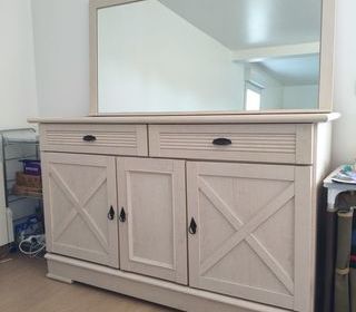 Je vends ce beau buffet/bahut en bois blanc avec miroir intégré. - Type de produit : Buffet/bahut - Matériau : Bois - Couleur : Blanc - Équipement : Miroir intégré - Nombre de