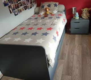 Vend chambre chambre enfant, lit 90 + matelas. Armoire (penderie+étagères) H180, P55, L98. Table de nuit, étagère H78, P34, L72. Dispo fin juillet. Possibilité de venir la voir.