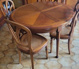 Salle à manger en merisier : Une table ronde de 115 cm de diamètre avec 4 rallonges de 40 cm (280 cm de diamètre max) avec 5 chaises assise en osier Un buffet avec 3 tiroirs et