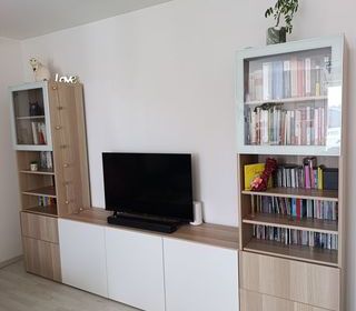 Meuble en très bon état Meuble TV + 2 colonnes, largeur totale 3 m Profondeur 42 cm, largeur espace tv 1.8 m Acheté 833 euros il y a 3 ans Lèvre mi novembre