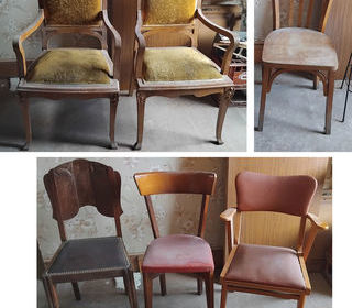 2 chaises Art Nouveau avec tissu vert 50 € la chaise Chaise de bistro 30 € Chaise en bois et cuir clouté 15 € Chaise cuir rouge, le cuir a pris des coûts 5 € la chaise Paieme