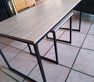 deux tables de salon gigogne bois et métal noir. Tr-s bon état. Vendues cause changement de décoration. mesures de la plus grande: 1mètre sur 50 cm. la petie est céarrée: 50 sur 5