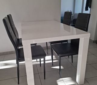 Table rectangulaire (160 X 90cm x hauteur 75,5 cm avec rallonge 200 cm en bois avec six chaises assorties. Les chaises (3 de chaque couleur marron - kaki) ont une assise rembourrée