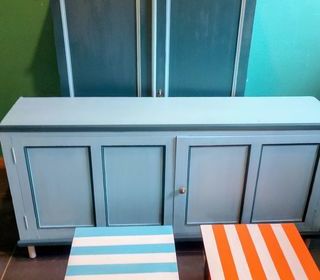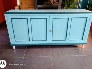 Petit buffet bas, 140 cm en longueur, et 70 cm en hauteur. Il s'agit d'un meuble ancien en bois, équipé de multiples casiers, très pratique pour tous styles de rangements. Repeint