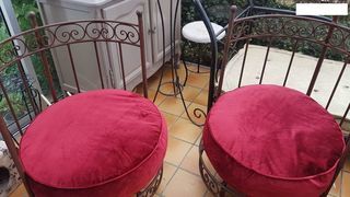 lot de deux fauteuils en fer forgé ( fer véritable , à repeindre avec peinture anti rouille) , style oriental . coussins d'assise déhoussables , avec fermeture éclair