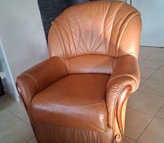 vend fauteuil cuir marron support en chêne