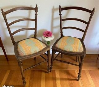 Lot de deux chaises anciennes en bois avec pieds et dossiers travaillés Assise recouverte de tissu turquoise et jaune, clouté, en bon état