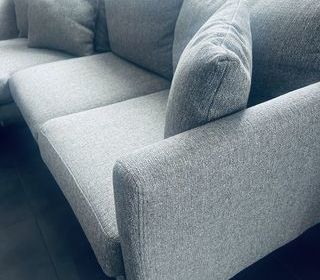 Canapé d'angle en tissu gris avec accoudoirs, méridienne à gauche, pieds en bois, fourni avec trois coussins assortis. Bon état. Achat fin septembre 2025. Vends cause déménagement.