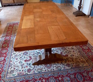 Je vends table de monastère en chêne massif; Originale dans conception le plateau est constitué d'un agencement de rectangles et de carres accolés l'un à l'autre avec le souci de