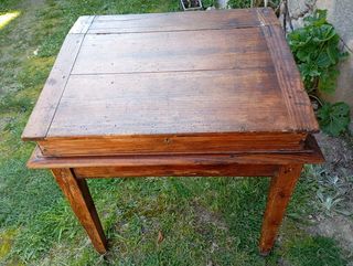 Traité, bien pratique pour y glisser à l'intérieur du classement dossiers ou autres. HAuteur total 83 cm. Dessus légèrement incliné largeur et profondeur 70 cm. Pieds. 67 cm de hau