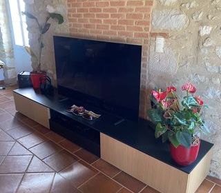 Meuble TV : 288 (L) x 52.40 (H) x 36 (P) Plateau de dessus, niche et petit tiroir sous niche laqué noir mat, tout le reste en bois chêne Au total, 2 grands tiroirs, 1 petit tiro