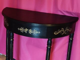 Console demi-lune en bois noir avec des motifs floraux gravés. L83cm (au plus large) 42 de profondeur Hauteur 75 Très bon état N'hésitez pas à me contacter pour plus d'inf