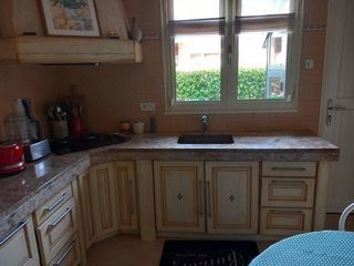 cuisine en châtaigner massif couleur provençal en bon état,, avec poignées, tiroirs de rangement , meuble pour frigo encastré, meuble buffet et porte de placard . meubles réalis
