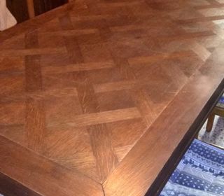Table chêne, plateau marqueterie 1,80 m x 1 m - 1 tiroir à chaque extrémité pour poser les rallonges avec marqueterie également de 0,60 m x 1 m. Fabrication menuiserie, années