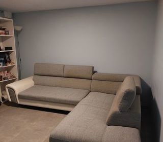 Double avec dossier tête amovible, bon état, en tissu et acoudoir en simili cuir, non convertible