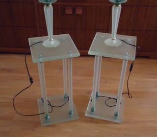 Vends 2 sellettes en verre fumé vert clair, avec les 2 pieds de lampe à poser couleur vert. Ensemble mais peut être vendus séparément. Dimensions : hauteur 61 cm - plateau dessus