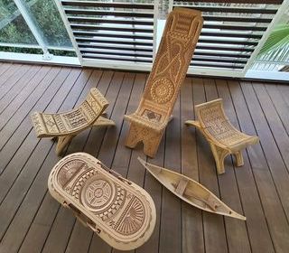 A vendre mobilier artisanal indiens SARAMACA GUYANE sculpté mains, très décoratif : 1 fauteuil (160 €), 1 petite table (80 €), 2 petits bancs (100 € pièce) et une pirogue (50€).