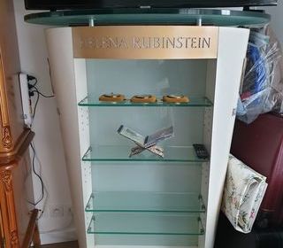 A VENDRE MEUBLE PRESENTOIRE DE QUALITE 2 FACES AUTHENTIQUE D'HELENA RUBENSTEIN DESSUS PLATE-FORME EN VERRE TREMPE ETAGERES DEVANT ET DERRIERE PRIX A DEBATTRE