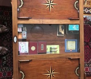 Magnifique table basse de salon L: 120cm; P: 80cm; H: 41cm. Caractéristiques : Deux plateaux de service encastrables et réversibles. Une vitrine centrale. Porte-magazines dan