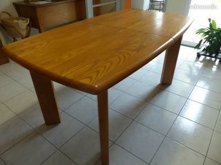Table forme "tonneau" en orme avec 1 allonge portefeuille. Longueur avec allonge 225cm (8 personnes), sans allonge 160cm (6 personnes), largeur 90cm. Épaisseur plateau 3cm. Livrais