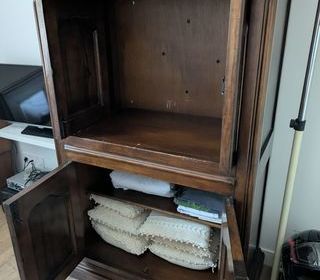 Cédons meuble Télé bois massif comprenant 2 compartiments, haut pour la télé et bas pour accessoires vidéo et/ou stéréo. H=158cm, L=108cm, P=53cm
