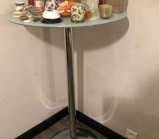 Vends mange debout (guéridon hauteur 106 cm ; diamètre du plateau 60cm). Le pied est en métal et le plateau en verre teinté. Remarque : Vendu sans les bougies de la photo !