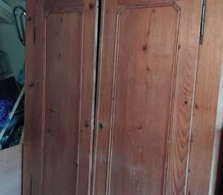 armoire ancienne ( environ 1960) en pin avec corniche. 2 portes de 168 cm x 62 cm, 4 étagères. Hauteur 211 cm, largeur 150 cm, profondeur 50 cm