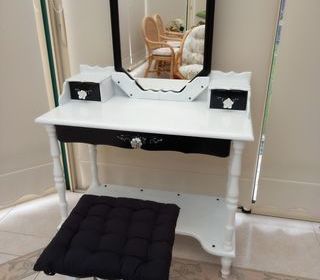 Vends une coiffeuse blanche et noire, travail artisanal en bois massif, un grand tiroir et deux plus petits motif rose. Miroir escamotable pour le transport ou le nettoyage. Tabour